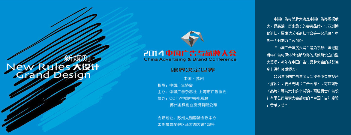中国广告与品牌大会是中国广告界规模最大、最高端、历史最长的会务品牌,与亚洲博鳌论坛、夏季达沃斯论坛年会等一起荣膺" 中国十大影响力会议"奖。 “中国广告年度大奖”是为表彰中国地区当年广告与媒体领域所取得的成就所设立的重大奖项,每年在中国广告与品牌大会的颁奖晚宴上进行隆重颁奖。 2014年中国广告年度大奖授予中央电视台(媒体)、麦肯光明(广告公司)、可口可乐(品牌)等共六十多个奖项。南通骑士广告设计有限公司荣获大会颁发的“中国广告年度设计贡献大奖”。