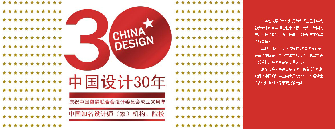 阅读详情 中国包装联合会设计委员会成立三十年表彰大会于2012年初在北京举行,大会对我国的著名设计机构和优秀设计师、设计教育工作者进行表彰。
