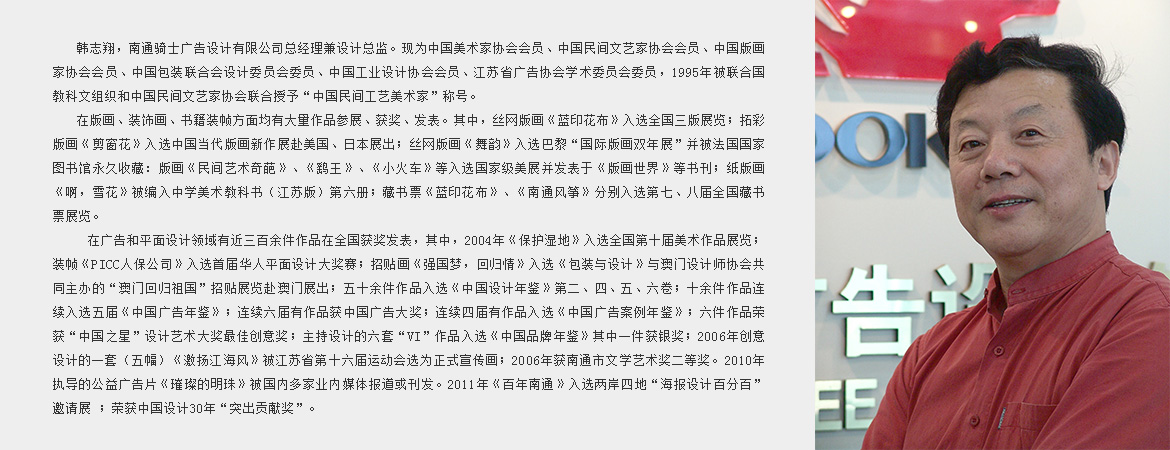 南通骑士广告设计有限公司成立于1993年。作为一家以平面设计为服务主体的设计机构,本着“创意领先、服务品牌”的理念,坚持“精、勤、诚、信”的四字方针,在二十年中取得了令人瞩目的成绩。近几年先后荣获“中国设计三十年突出贡献奖”“中国广告年度设计贡献大奖”,骑士也成为名副其实的品牌设计专家,为国内学界和业界的诸多同行所肯定和赞扬。